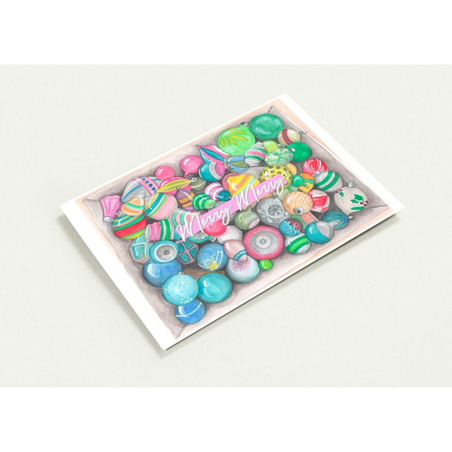Spread joy this holiday season with our Vintage Christmas Tree Ornaments Greeting Cards. Featuring an original painting of vintage ornaments in a box adorned with the cheerful phrase 'MERRY MERRY', these personalized folded cards (pack of 10) are perfect for sending warm wishes to friends and family. The inside is blank, allowing for your heartfelt messages. Choose from premium paper options including glossy coated silk, perfect for vibrant images, or luxurious matte for an elegant touch. With high-quality, eco-friendly paper options (350gsm coated silk or 300/350gsm matte), you can enjoy sustainability without sacrificing quality. The stylish rounded corners and elegant foil accents in gold, silver, or copper elevate the sophistication of your cards. Envelope options include no envelope, standard, or premium for added variety. Make your seasonal greetings special—order your pack today!